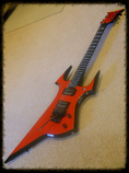 Lowery Ghost in red and black with black hardware and Seymour Duncan pickups.